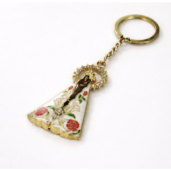 Chaveiro Nossa Senhora de Nazaré com resplendor cravejado, elegante e cheio de significado. Produzido em metal de qualidade, disponível nas cores prateado ou dourado, com detalhes em strass que garantem brilho e sofisticação. Ideal para uso pessoal, presente ou lembrancinha religiosa. Comprimento do chaveiro 12cm.