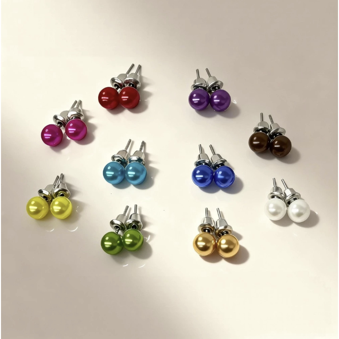 Kit com 12 pares de brincos modelo pérola colorida, tamanho 6 mm de diâmetro, com fecho em tarracha. Elegantes, delicados e versáteis para o dia a dia. Acompanha mostruário, ideal para organização, uso pessoal ou revenda.