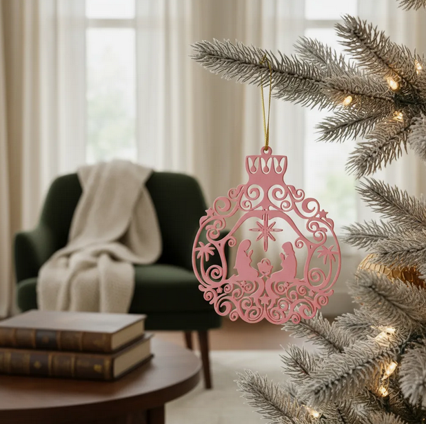 Kit 2 Pendentes Presépio 3D para Árvore de Natal — Charmosos enfeites medindo 11 cm de altura x 9 cm de largura. Acompanham gancho para pendurar na árvore ou porta. Disponíveis nas cores rosa, vermelho e branco.