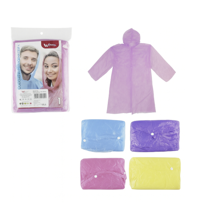 Capa de Chuva Adulto Unissex Impermeável e Reutilizável, feita em plástico 100% impermeável, com capuz e fecho em botão. Leve, prática, fácil de transportar e armazenar. Enviada em cores variadas. Econômica, ecológica e ideal para emergências ou uso diário.
