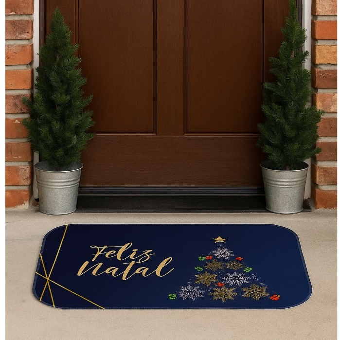 Capacho natalino confeccionado em 100% poliéster com base emborrachada antiderrapante, garantindo segurança e durabilidade. Medindo 34x60 cm, possui estampa digital de alta qualidade com cores vivas e detalhes elegantes, ideal para criar um clima festivo e acolhedor na entrada da sua casa durante as festas de fim de ano.